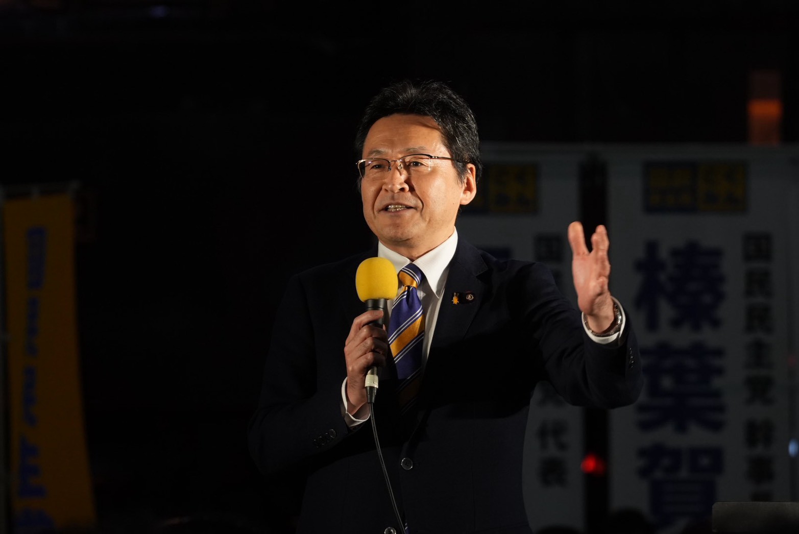 礒﨑哲史役員室長(参議院議員/全国比例)は「ガソリン暫定税率の廃止をずっと訴えてきたが、みなさんの声が集まることで、この問題が前に進むようになった。みなさんと一緒に政治をつくっていきたい」と訴えた。