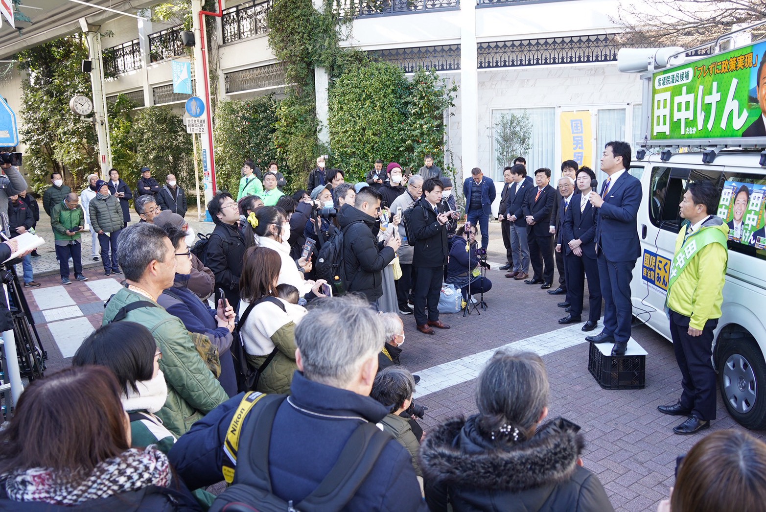 続いて玉木代表は「田中候補はガソリン暫定税率廃止法の答弁者や党の経済調査会会長として、誰よりも働いてきた」と候補を紹介した。その上で「自民党が急遽主張してきた食料品限定の消費税率0%は外食産業に大打撃である上、中身が詰まっていない政策である。我が党としては修正案や対案を出して、正しい方向へガイドするナビの役割を果たしたい」と訴えた。