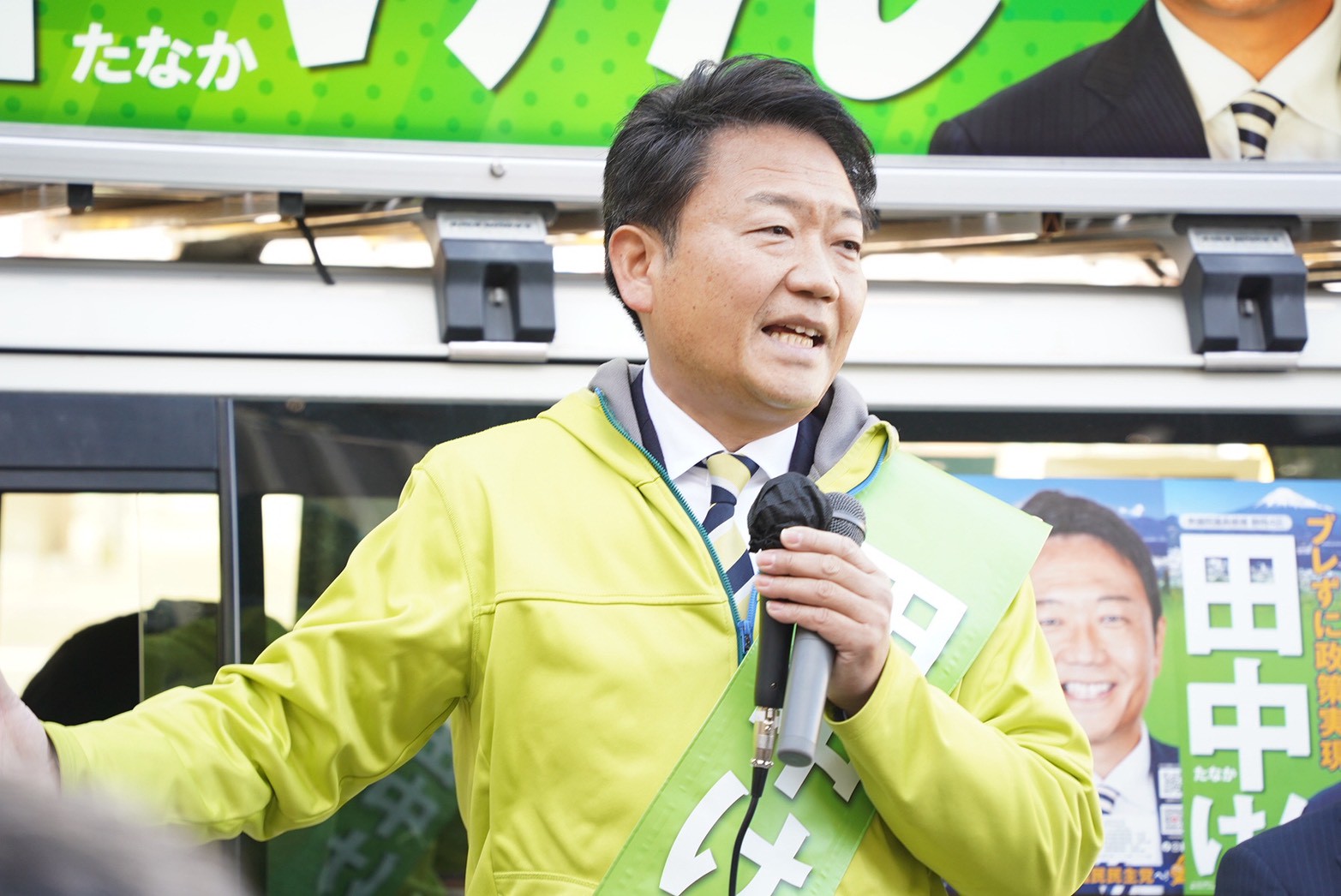 田中けん候補は、「1年3ヶ月という期間は短いけれど、その間ガソリン暫定税率廃止の実現など、野党でも政策が通せることを実感した」と述べた。「与党が過半数の議席を取れば、党利党略により国民にとって大切な議論ができない可能性がある。実際にガソリン暫定税率廃止法案などは最初審議すら応じじてもらえなかった」と主張し、党への後押しを訴えた。